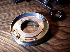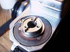 露出計まわりを分解して,いろいろ調べたところ,セレン光電池は生きていることがわかった。したがって,問題点は,調整ツマミの可変抵抗にあると考え,分解を行った。まず,裏蓋をはずし,巻き戻し軸の中央のネジをはずして(左),巻き戻しクランクを取りはずす(右)。