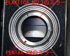 中央部およびその上は問題ないのだが,下の方では,像がかすかに二重になっている。中央や上部は,おそらくPENTAX KMのミラーがはたらいているのだろうが,下部はPRAKTICA MTL3のミラーがはたらいているのだろう。ということは,プラクチカのミラーは,裏面鏡なのか?
