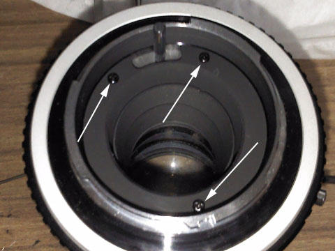 虹彩絞りは,後ろの方にあることが多い。そこで,後玉をはずすことにする。この3本のネジをはずして,カバーを取る。