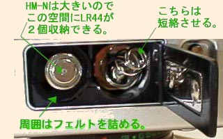 このカメラは,電源として水銀電池HM-N(1.35V)を2個必要とする。この電池は入手困難なので,電池ボックスを少し改造して,LR44を2個使って動作するようにした。