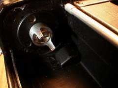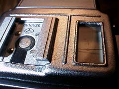 露出計まわりを分解して,いろいろ調べたところ,セレン光電池は生きていることがわかった。したがって,問題点は,調整ツマミの可変抵抗にあると考え,分解を行った。まず,裏蓋をはずし,巻き戻し軸の中央のネジをはずして(左),巻き戻しクランクを取りはずす(右)。