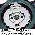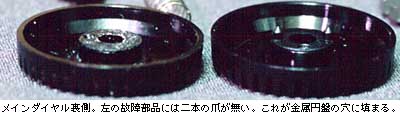 翌日,私は長めの精密ドライバーを購入し,トップカバーを完全に外すことが出来た。そしてメインダイヤルスイッチの構造を理解できた。内側には金属の円盤があり,その一部に穴が空いていて,そこにボディ側に有るメインスイッチのツノがささる構造になっている。一方で外側のプラスチック製のメインダイヤルと内部の金属の円盤とは二本の爪で結合される構造になっているようだが,その爪が完全に無くなっていた。きっと馬鹿力の持ち主がロックボタンを押さずにダイヤルを力任せに回してしまい,ギロチンのように爪を折ってしまったのだろう。