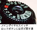 私はアロンアルファでプラスチック製のダイヤルと内部の金属円盤との接着を試みたが,接着部がダイヤル操作時にかかる応力に耐えきれず,成功しなかった。その後しばらく試行錯誤を繰り返していて,メインダイヤル中央のロックボタンと内部ロックレバーが長穴を介してリジッドにネジ止めされていることに気づいた。ロックレバーは金属円盤と噛み合う構造のため,ロックボタンを回せば内部金属円盤,しいては内部メインスイッチを動かせる事を発見した。そこでロックボタンを爪で回せるようにのこぎりで溝を入れ,組み上げてみた。ちょっと操作はしにくいが,かくしてロックボタンの爪による操作でカメラはフルモードで写せる状態にまで復活した。(この状態でフィルム1本撮影し,カメラに何等問題の無い事を確認している。)