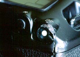 破損した測距点選択ボタン部分。これは一度分解し、砕けた部品を取り除いた状態。背後に見える液晶表示部分のアクリルカバーが浮き上がっているのが分る。