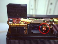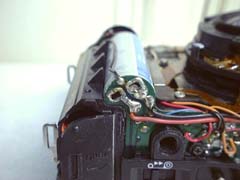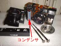 カバーをはずしたところ。シャッターボタンの下に見える灰色のものがコンデンサ。