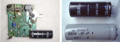 コンデンサは,手もとにあったコダックの「白黒うしし」というレンズ付きフィルムから取り出したストロボ基板に使われているものと同じである。サイズ的には「白黒うしし」の方が小さいので物理的な問題もなく,これと交換することにした。