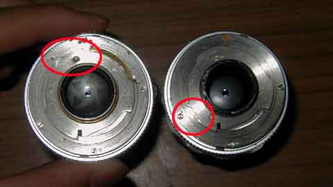 上の画像で,左が,Retina Reflex用レンズのマウント,右がBESSAMATIC用レンズのマウントである。赤で囲んだ部分のように切り欠きの位置が異なるが,基本的に同じマウントである。この切り欠きの位置が異なるため,BESSAMATICにRetina Reflex用レンズを取りつけようとしても,下の赤で囲んだ「爪」がじゃまをして取りつけることができない。したがって,この「爪」を削れば,BESSAMATICにRetina Reflexのレンズを取りつけることができるようになる。