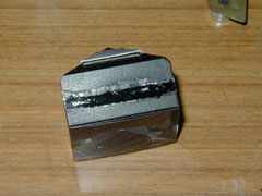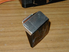プリズム前面は,腐食したモルトに沿って,蒸着面が腐食している。ファインダーを覗いたとき,その部分は光が反射しないので黒い影になっており,なにも見えない。それは,撮影の大きな支障になる。そこで,その部分をまずはガラスを傷つけないように削ぎ落としていく。