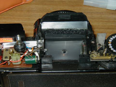 プリズムを取り出すためには,上部カバーを開ける必要がある。これは,右側1本,左側3本のネジで止められている。左側は,表から見えるネジのほかに,巻き戻しクランクの下と,貼り皮の下にそれぞれ1本あるので,気をつけてみよう。