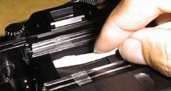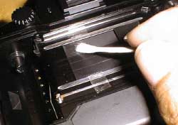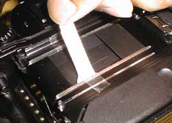 ミラーボックス側からも清掃します。これには多少のコツが必要で、クリーニングペーパーを途中でL字に曲げてシャッター幕の間に挿入できるようにします。そしてベンジンを浸してシャッター幕の間と、24x36mmのマスクに隠れた部分(ここは裏ブタ側からでは拭けない)を清掃します。