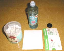 綿棒の先を指である程度平らにつぶして、シャッター幕への接地面積を大きくしたほうが拭き取り効率が良くなります。その綿棒にベンジンを浸して、シャッター幕表面の汚れを拭き取ってゆきます。この際に決して無理な力をシャッターに加えてはいけません。優しく拭き取ってください。