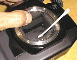 上記と同様の清掃作業を、ミラーボックス側からもします。ミラーを手で跳ね上げて押さえておけば作業は可能です(EOS RTはこの作業が出来ないので、不良品には手を出さない方が良いですよ)。この清掃の時には綿棒はシャッター幕にほぼ垂直に近い角度で当たりますので、綿棒の先をその状態で接地面積が大きくなるようにつぶすことがコツです。