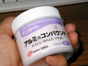 動作はするが,なんといっても見た目があまりにも悲惨なので,とりあえず磨いてみることにした。布にアルミ用コンパウンドをとり,少しずつごしごしと磨いてみた。サビや汚れがおもしろいように落ちていく。ただ,細かいところは力をいれにくく,けっこう面倒である。手持ちぶたさなときに,ちょこちょこ磨きつづけるのがいいかもしれない。