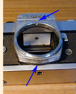 すると,この部分のカバーが簡単にはずれ,マウントを固定するネジがすぐにあらわれる。このボディは,この4つのネジが緩んでいたので,きちんとしめなおすことにした。