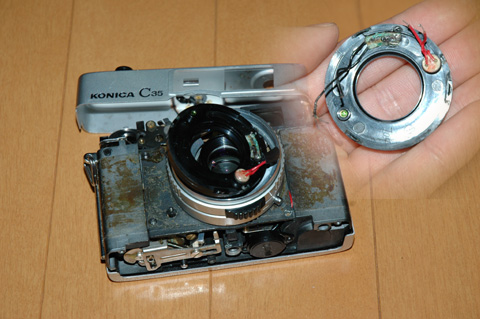 まず,正面左右の貼り革をはがす。そしてあらわれたネジ4本をはずして,レンズボードごと取り出す。このとき,レンズボード(向かって)右下部分に腐食があり,それにともなって配線も腐食しているようすがうかがえた。いったん,ボディ内から鏡胴の受光素子へ至る導線を切断し,鏡胴を分解する。