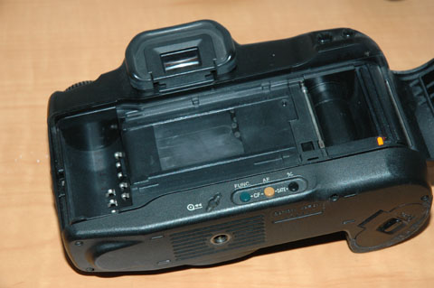 「シャッター幕に油」というのは,この時代のEOSに特徴的に見られる症状である。これは,シャッターに設けられたゴム部品が劣化し,油状になってシャッター幕に付着するもので,症状が重くなるとシャッター幕の動作に重大な支障をきたすようになる。この油状物質の清掃作業については,すでにKEN氏が何度かにわけて,そのコツも含めて公開されているので,そちらも参照。