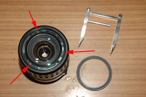 前玉と後玉の表面を清掃しても,まだ,カビのある面が1つ見える。カビがあるのは広い面であることから,前玉の裏側あたりだろうと予想できたので,前玉からはずしてみることにする。レンズ正面のプラスチックのリングをカニ目回しではずすと,前群レンズを止めているネジがあらわれる。その3本のネジをはずすと,前群は簡単にはずれ,その裏側にあったカビを同様に拭き取ることができた。ここまでの分解・組み立ては容易であるが,プラスチックの弱そうな部品で構成されているため,ネジを強く締めすぎないことがとくに重要かもしれない。