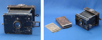 このテナックスは,6cm×4.5cm判のアトム判とよばれる乾板用のカメラで,たたむと手のひらにすっぽりおさまるくらいの小さなカメラである。