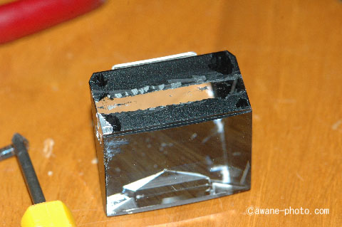 ミラー状の塩ビ板をプリズムの大きさに切り取り,プリズムにあてがって元の位置へはめこむ。