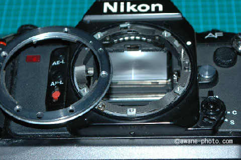 それぞれ,「Aはオートフォーカスが動作しない」「Bは露出計連動Aiカプラが動かない」点を除いて,動作に問題点は見られない。AのAFカプラを直すのは難しそうに思われたので,AのAiカプラをBに移植して,ニコイチすることにした。「ニコイチ」とは,「2個」の故障品から使える部品を融通しあって「1個」の動作品をつくりあげることをいう。
