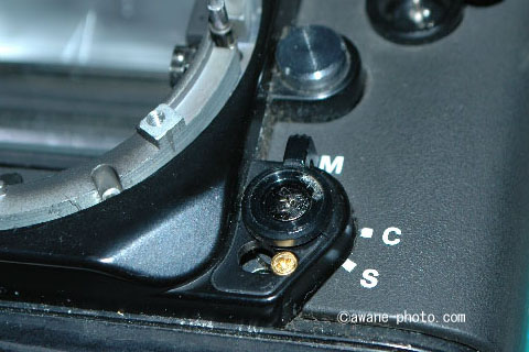 つぎに,AF/MF切り替えレバーをはずすが,ネジが見当たらない。こういうときは,貼り革の下にネジが隠れているのが1つの定番パターンだということは,覚えておこう(笑)。切り替えレバーをはずし,さらにその下にあるネジもはずしておく。