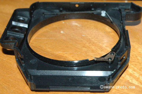 AおよびBから,Aiカプラがついているマウントまわりのカバーをとりはずす。そのためにはまず,マウントを止めている5つのネジをはずす。