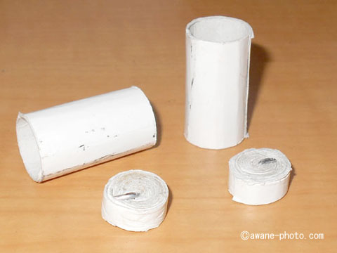 円筒部分は,単に厚紙を筒状にしただけのものである。底上げの部分は,針金を心棒にして,それを中心に細長く切った厚紙を巻きつけていったものである。心棒にした針金は,両端を曲げることで,電池の接点になる。これで,CR2型電池をCR123A用の機器で使うことができるようになる。