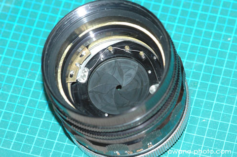 さらにリングをはずしていくと,絞り羽根に到達する。レンズを1枚1枚はずさなくても,このユニットをすっぽりとはずせたのではないか?(^_^;