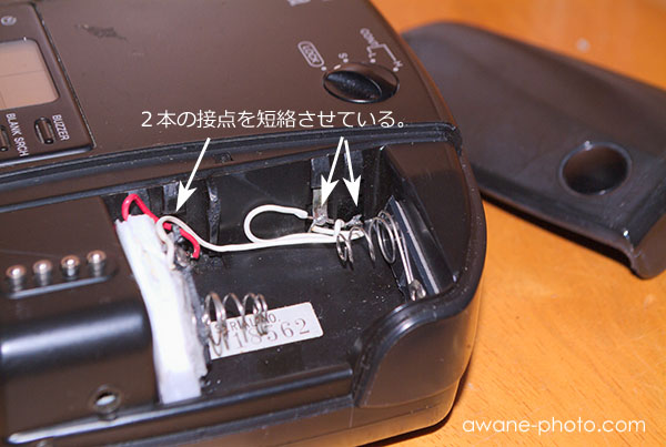 電池ボックス内には,+極,−極ともに,2本ずつの接点があった。MVC-C1本体にACアダプタを接続し,専用バッテリーパックをここにセットしておけば,専用バッテリーパックに充電することもできる。そのため接点が2本ずつあるのは,1つがバッテリーパックへ充電するためのもの,1つがバッテリーパックからカメラに電力を供給するものであると考えられる。専用バッテリーパックの端子はここを短絡するだけの大きさがあるので,この接点は短絡しても問題ないと考えられる。そこで,この接点は短絡し,CR123A型電池が入るようにした。