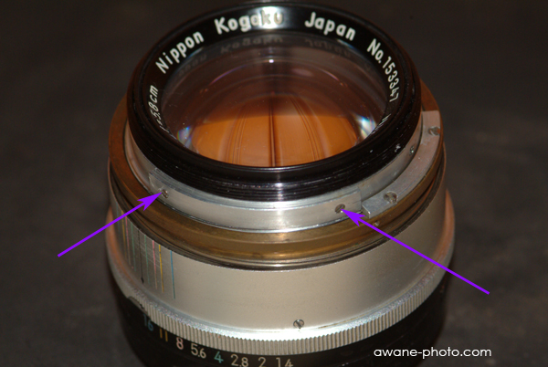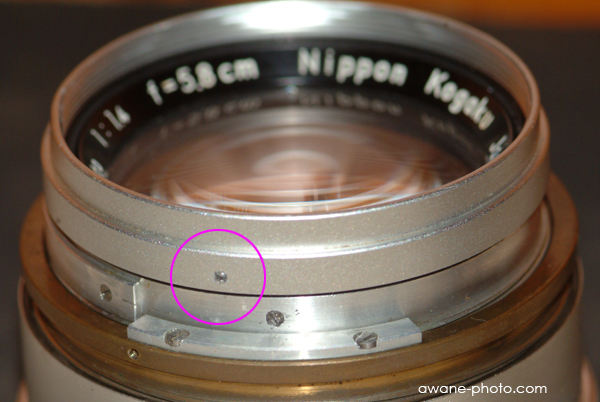 目的地は,絞り羽根である。前玉から分解できれば楽に思うが,正面の銘板ははずせそうにない。鏡胴先端に小さなネジが見えたので,まずはピントリングをはずすことにする。