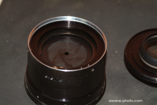 絞りリングの動きが固い。また,絞り羽根の動きが鈍いことがある。よく見れば,絞り羽根に油のような滲みも見える。絞り羽根を清掃する必要があるようだ。