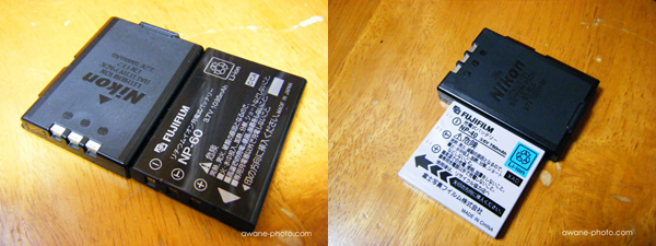 まず,EN-EL2と富士フイルムのバッテリーNP-60と並べてみると,よく似た大きさであることがわかる。しかし,端子の配列が異なるので,NP-60をEN-EL2の代用にすることはできない。そこで,ひとまわり小さなNP-40を,EN-EL2の殻に内蔵させることにする。